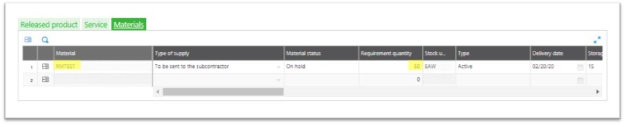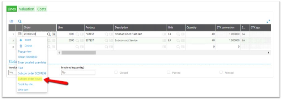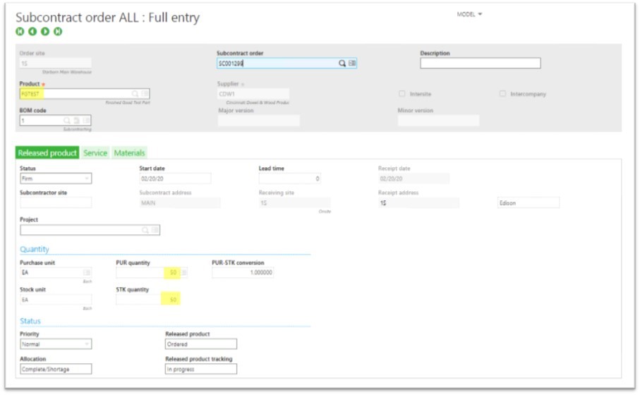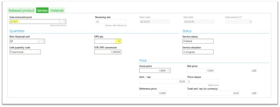 1. Create a subcontract order as normal and generate the subcontract PO. In the example below we ordered 50 each of FGTEST. This translates to 50 each of RMTEST and SSTEST, raw material and subcontract service, respectively.