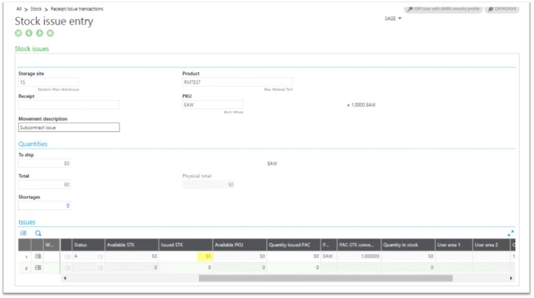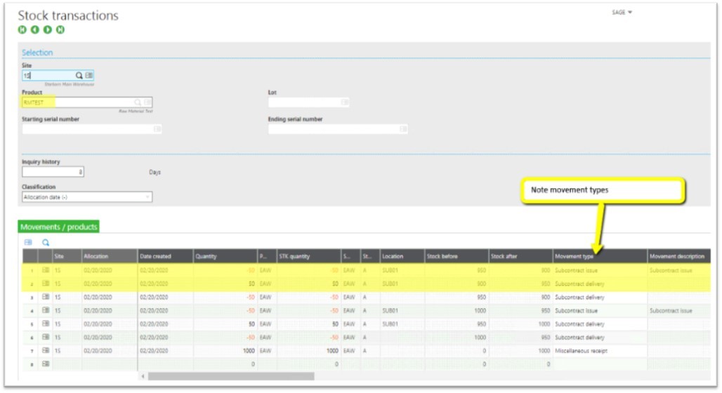 9. Stock Transactions will also show all 50 of RMTEST being consumed from the subcontract location.