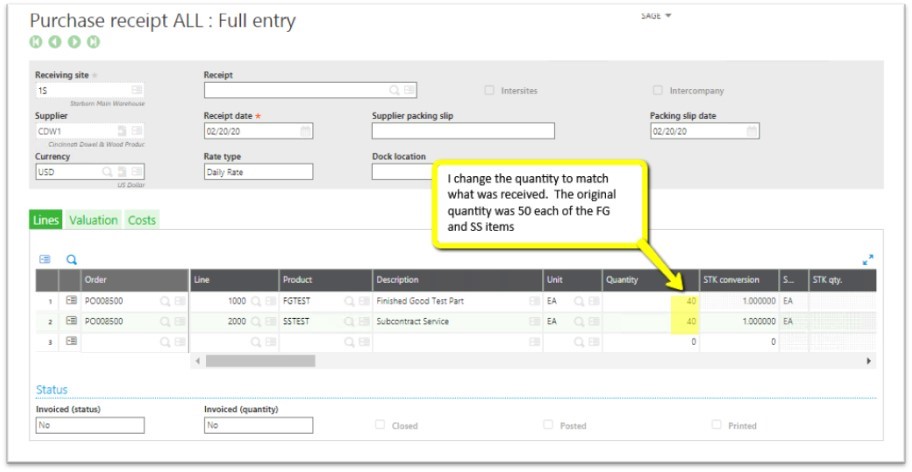 3. Receive the finished good (FGTEST) from the supplier. The assumption here is that the supplier only produced 40 of the required 50 of FGTEST but consumed all the material.