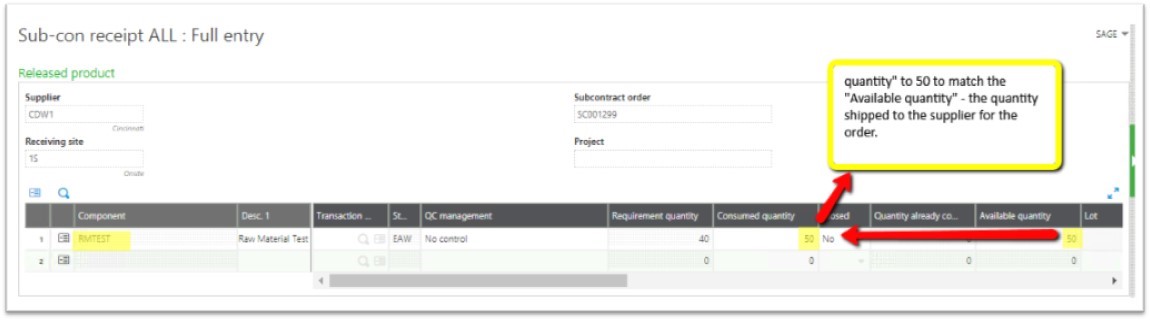 5. The following window will appear. Change the quantity to 50 to match the “Available quantity” and consume all the RM shipped to the supplier. After you change the quantity, click “OK”.