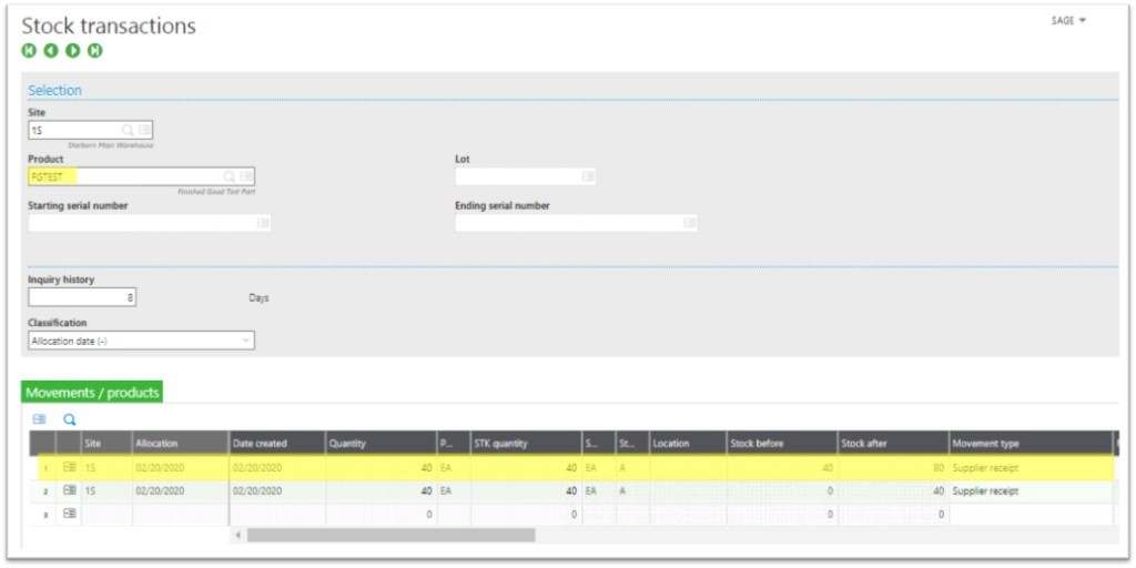 8. Stock Transactions show 40 each of FGTEST being received to stock.