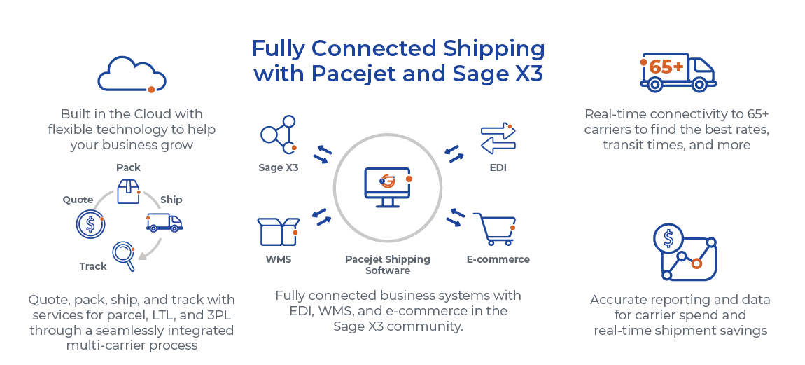 - Native Sage X3 integration: Pacejet seamlessly integrates into Sage X3 and uses native integration to provide real-time connectivity and enhance your multi-carrier shipping strategy. Compatible with Sage X3 Version 12 and future releases.