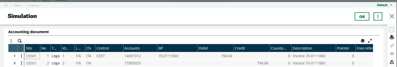 • Yes – always. ‘Yes – always’ generates a simulation entry for all the journals. This will prevent the user from posting transactions to the General Ledger. During the generation, a screen automatically opens and displays the simulation results and potential warning messages. During mass processes, all the entries are displayed.