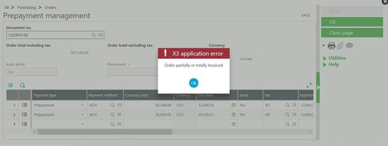 In a previous edition of the X3 Insider, we reviewed how to set up prepayments on purchase orders in Sage X3. In this post, we will explore creating multiple prepayments for purchase orders and how you can avoid the error message: Order partially or totally invoiced.