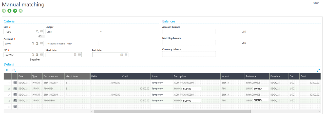 - Note that in the manual matching all looks correct, the prepayments associated with the invoice: