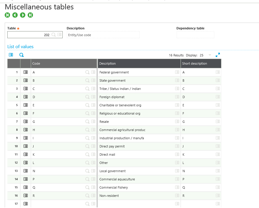 However, if we enter an exemption value in the Entity/Use field, the system will determine if the tax exemption is valid on the transaction’s jurisdiction and will consequently apply it in the calculation. Below is a list of the regular Entity/Use codes. This list is maintained in Common Data / Miscellaneous Tables: