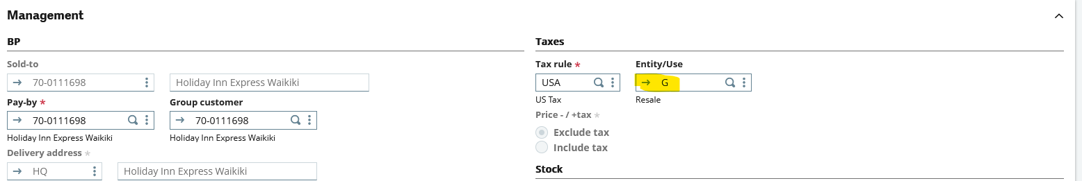 There can be situations where a customer who is usually taxed needs to avoid calculating taxes for a single transaction. In these cases, there is a field in the invoice generation labeled Entity/Use that handles the exception on an individual transaction basis.