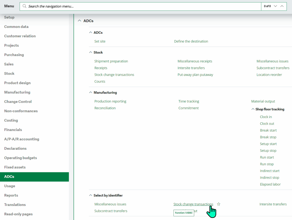 The screenshot below is the location in X3 navigation menu to perform the stock change via the ADC Web Client functionality.