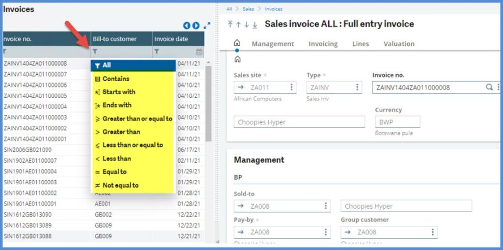 If you only want to see invoices for Bill-to customer NA009, for example, you can select the filter Equal to and enter NA009.