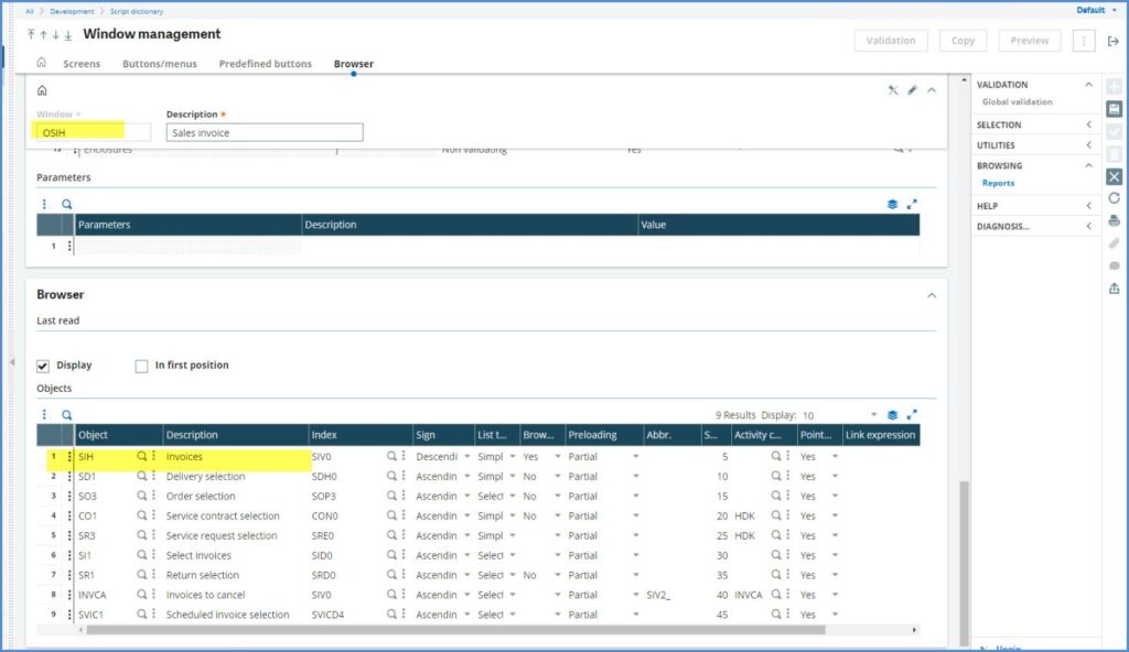 Select the Window OSIH. Remember don’t select the Windows beginning with “W”. Those are system generated and will be overwritten upon validation. On the Browser tab, go to the Object grid and Jump to the SIH Object.
