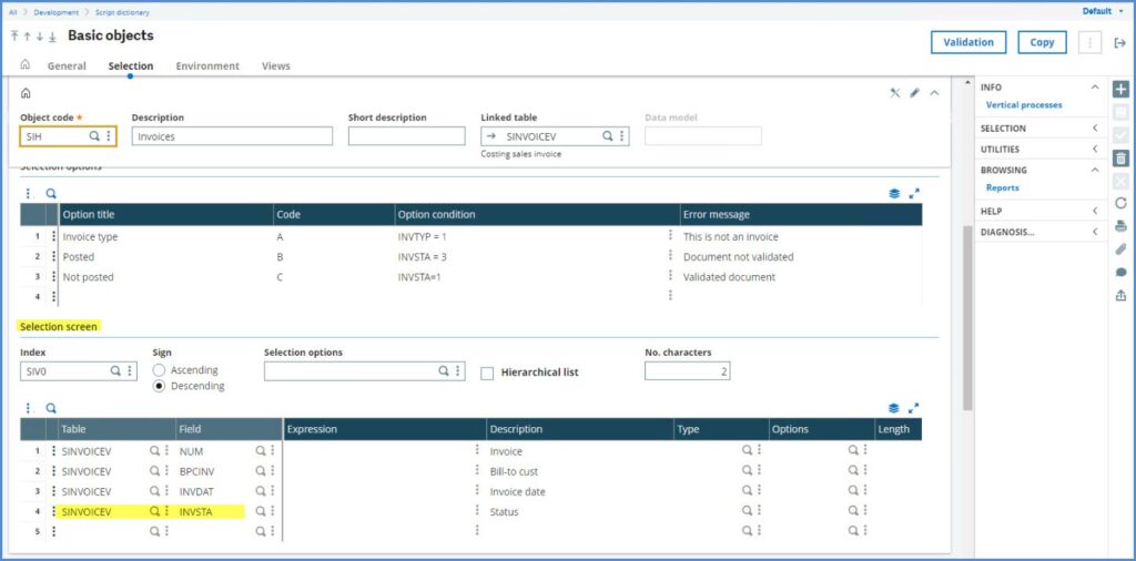 In the Selection screen grid, add Table INVOICEV with Field INVSTA. Click the Save icon and Validation.