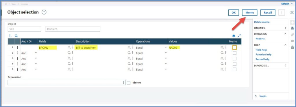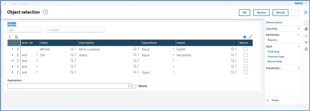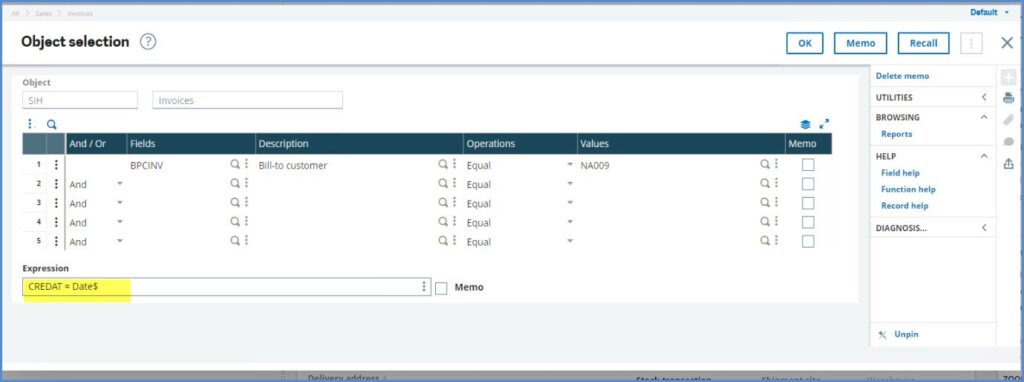 What if you want to see invoices that were created today for NA009? Not those with today’s accounting date, but invoices that were actually created today. On the Expression line of the Object selection, enter CREDAT = Date$. The Expression field is linked to the other grid lines with “AND”.