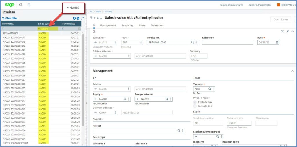 If you click on NA009 with Not posted…, you can verify that the selected invoices for NA009 are Not posted.