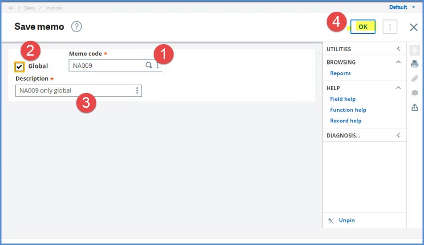 - Global: if this is selected, everyone will have access to this Memo code. If not selected, it is your own personal code.