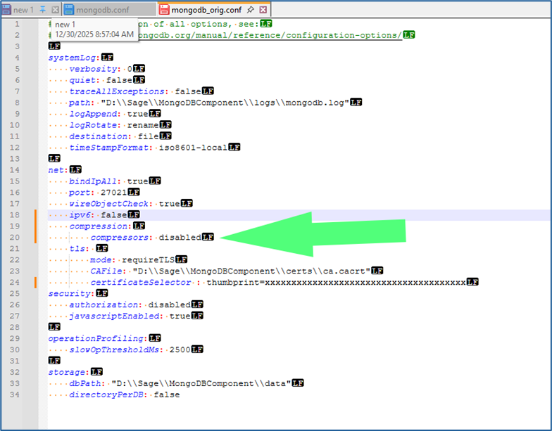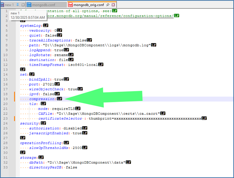 To address this vulnerability, MongoDB recommends using alternative compression protocols or disabling compression entirely as a workaround. Sage has released hotfix update editions of MongoDB for versions 4, 7, and 8, covering multiple patch levels of Sage X3 V12. For customers who choose not to apply the hotfix—or for earlier Sage X3 versions where no hotfix will be released—Sage recommends updating the MongoDB configuration to disable the affected compression method. Net at Work has tested and validated this mitigation when implemented using the procedures outlined below.