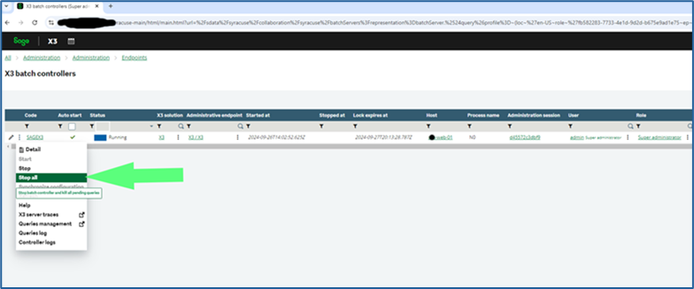 - Click on the 3 vertical dots and select “Stop All” to stop the batch server