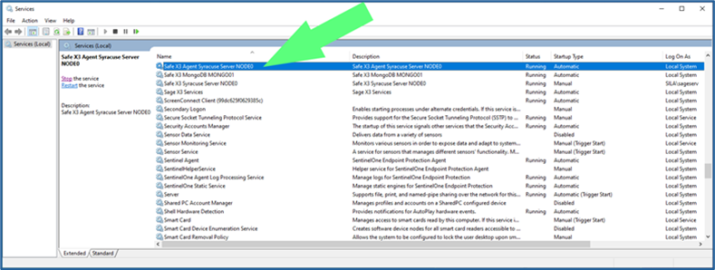 - Stop the service named “Safe X3 Agent Syracuse Server NODEx”