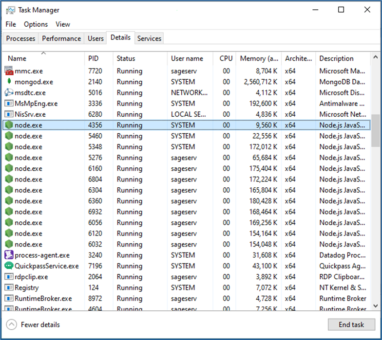 - If this service hangs up during the stop procedure, open Task Manager, go to the Details tab, select each instance of the “node.exe” process, and click End Task