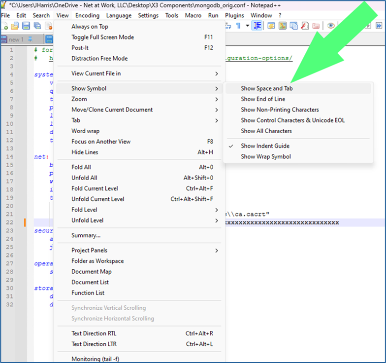 - On the upper tool bar, select View – Show Symbol – Show Space and Tab and View – Show Symbol – Show End of Line