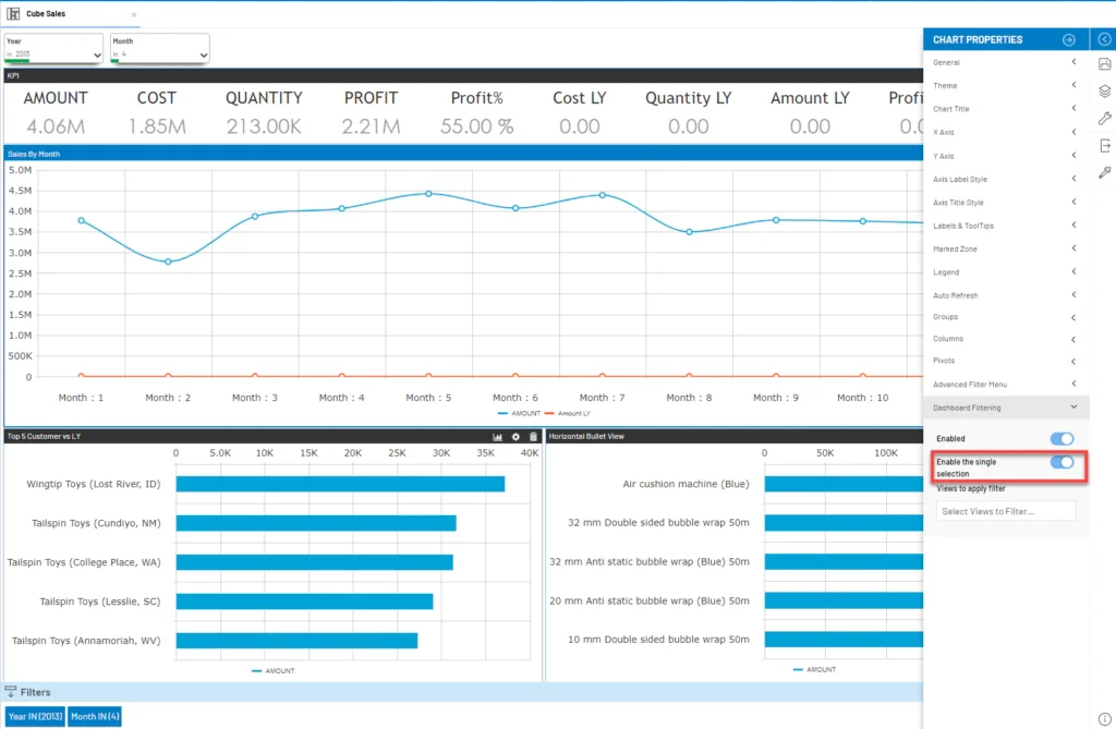 Save time and drill down on dashboard data with just one click by turning on the “Enable the single selection” function in “Chart Properties.”
