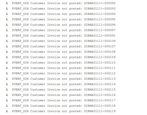 1 $VERF_SIH Customer Invoice not posted followed by the invoice number. These are Sales or BP Customer invoices that haven’t been posted. They can be posted individually from their respective entry screens or in mass. Sales invoices can be posted from Invoice/Credit memo validation under Sales, Invoices. For BP customer invoices in mass, post under A/P-A/R accounting, Invoicing, Customer BP invoice posting. After you are finished,. the journals generated will have to be moved to Final Status.