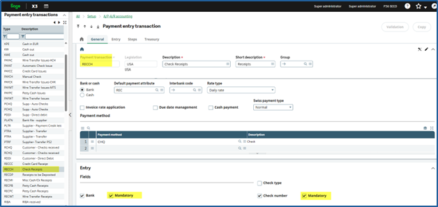 After saving, you should now see checkmarks in the Mandatory column for both Bank and Check Number on the RECCH line.