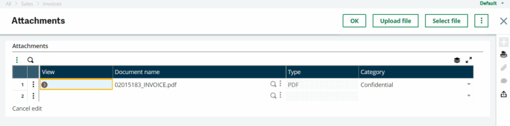Files can be attached to any standard Sage X3 object-based function such as Sales Orders, Customers, Invoices, etc. through the Attachments button.