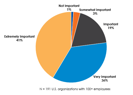 Companies know data backup is necessary. As shown in the chart below, 77% of organizations with 100 or more employees say that data protection is very or extremely important to their organization. Another 19% deem it “important.”