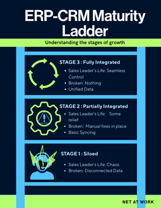 If your team maintains shadow spreadsheets, asks ops for information that should be in the CRM, or debates “which number” to use in forecast meetings, you’re at Stage 1. If some data syncs but reps still double-check everything before trusting it, you’re at Stage 2. If your CRM shows real-time ERP data and everyone trusts one source of truth, you’re at Stage 3. Most mid-market companies are stuck between Stage 1 and Stage 2.