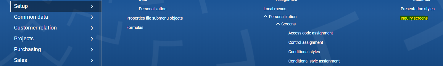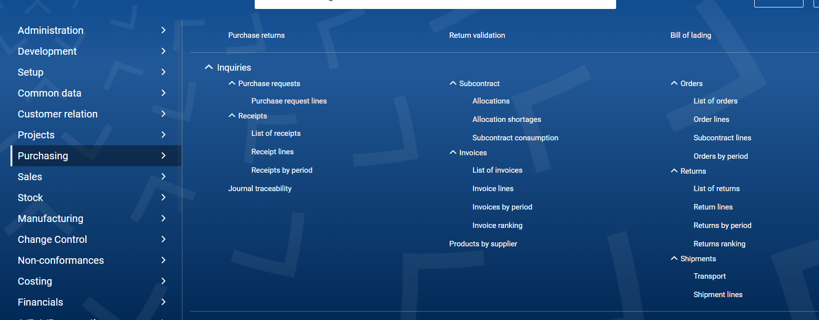 You can navigate to sub-menus for inquiries for each module of the application. Purchasing will have its own dedicated submodule, and so will Sales and so on and so forth.