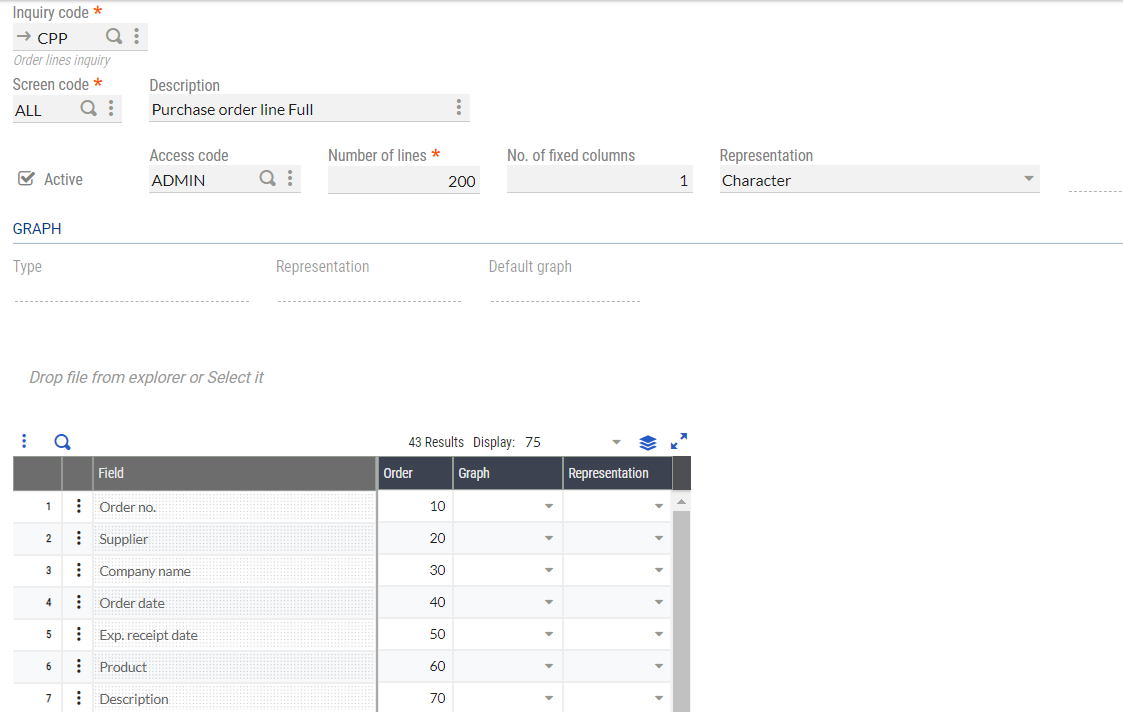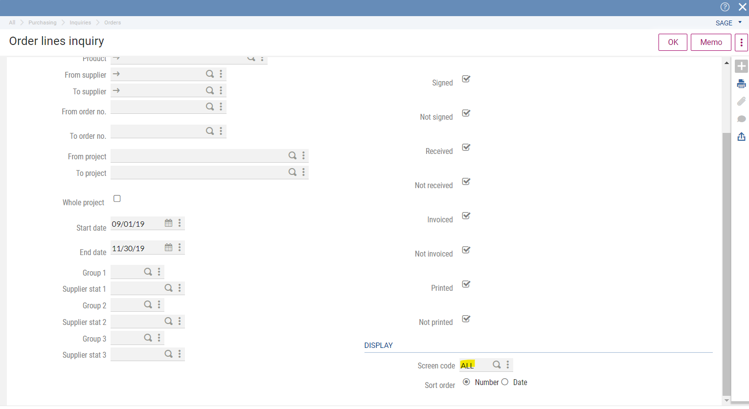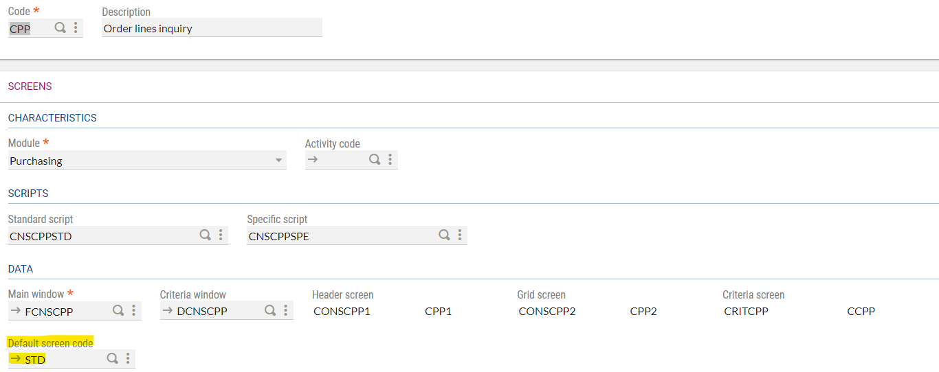 The default code is STD when you open the CPP inquiry for ‘Order lines’. You can change the default screen code to ALL to display all fields.