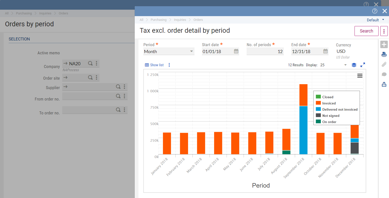 In the example above, found in Purchasing > Inquiries > Orders, the ‘List of orders’ will point to the document header information while the ‘Order lines’ inquiry will display line item data. Both will allow you to drill down to the detail by clicking the Options menu (dots) for each line presented.