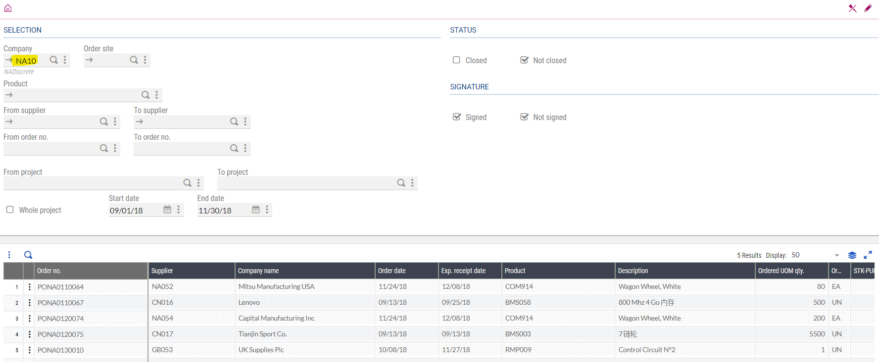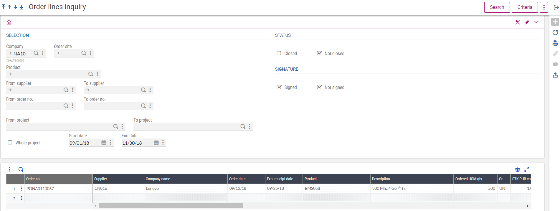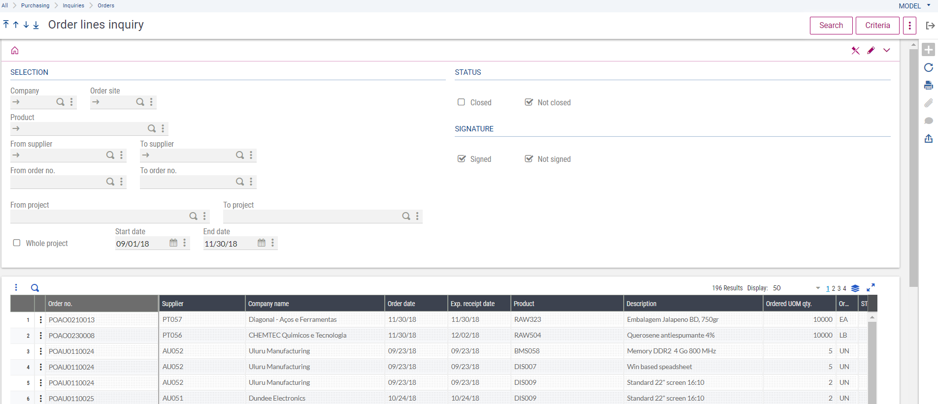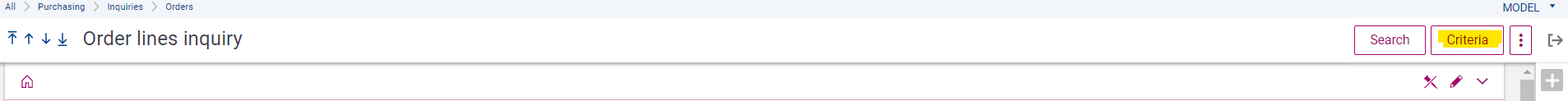 You will first be asked to enter the selection parameters in the header and then the lines will be displayed after clicking the Search button in the top right corner.