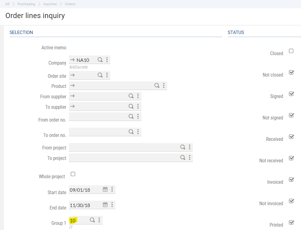 Being able to filter by statistical group is one of these criteria. It is extremely useful to reduce the number of values displayed in the lines. You can easily imagine a situation where you would only want to see a subcategory of your item master and only show those purchase order lines. By simply selecting it in the list, you can now concentrate on those SKUs and see who you purchased them from for a given time period.