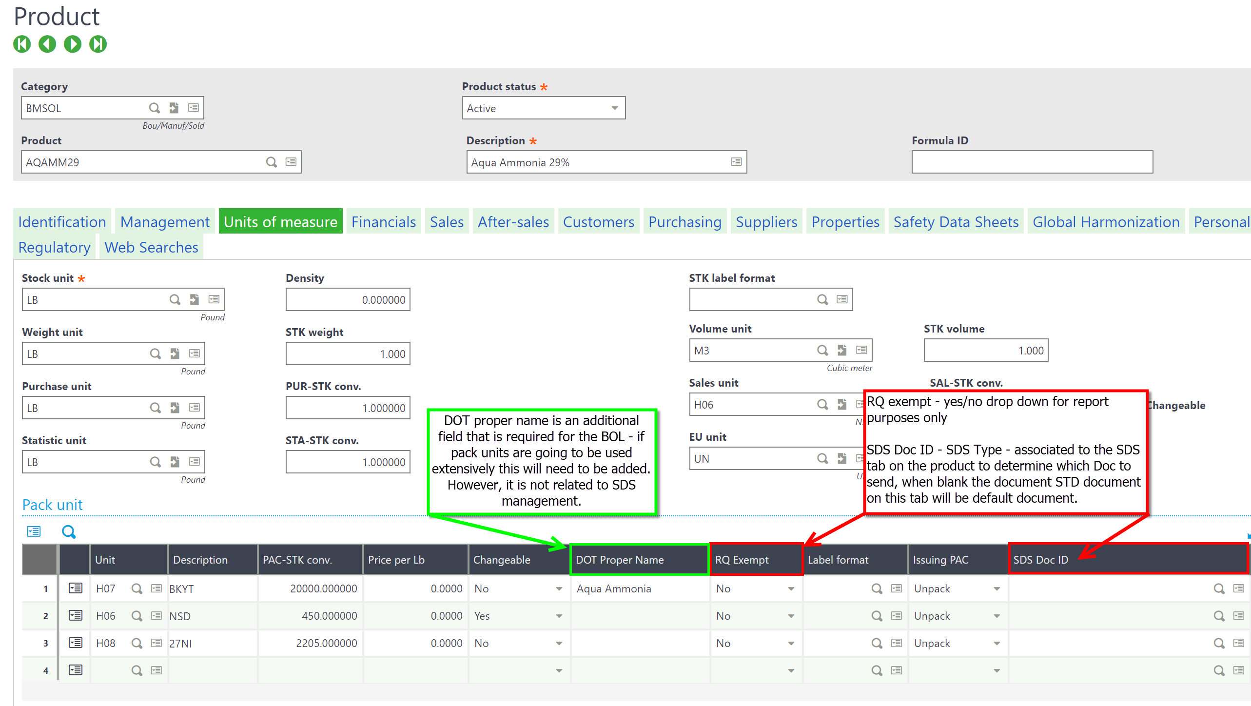 The hazardous nature of some chemicals varies depending on the amount. This means the SDS will be different depending on the packing unit. To accommodate, Net at Work has enhanced the pack unit features of Sage EM: