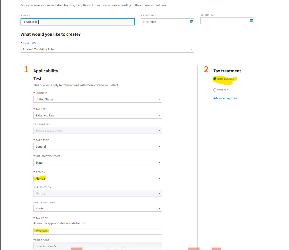 Begin by choosing whether this rule makes the item taxable or nontaxable.