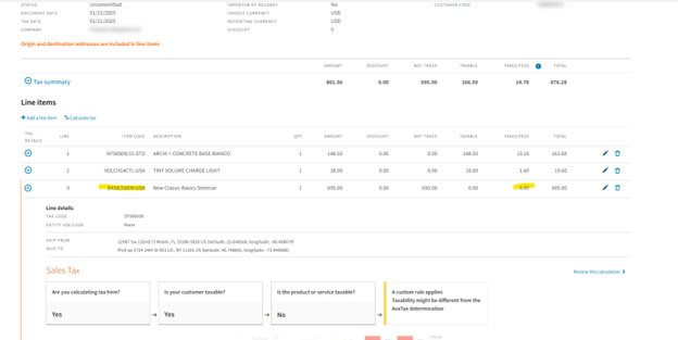 For example, in the invoice below, a service (New Basic Seminar) should be exempt from sales tax, while the other products remain taxable. Here’s how to configure this rule in AvaTax: