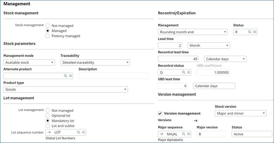 - Mandatory lot: lot has to be entered at receipt (purchase or production declaration)