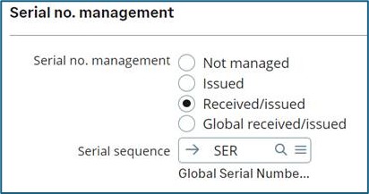 - You cannot change this value from Received / issued to Global received / issued. Use the Serial management modification function (FUNSERMGT) to do this instead.
