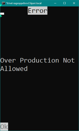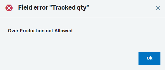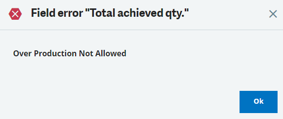 If you try to enter more than the remaining open quantity from the work order, you will get the following message: