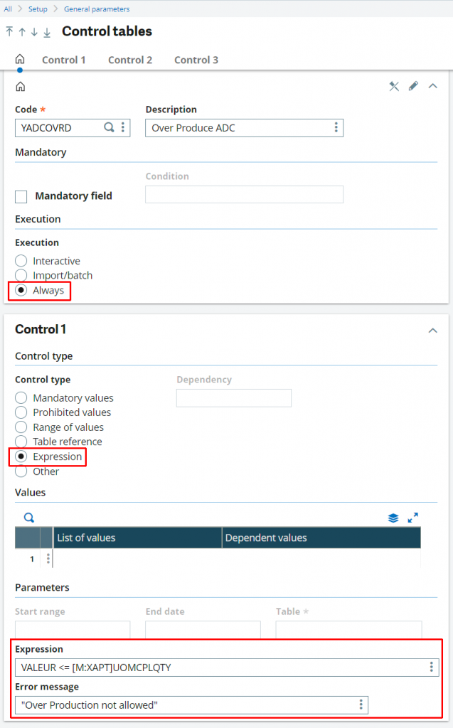 The first step is to create new Control Tables under Setup > General Parameters > Control Tables