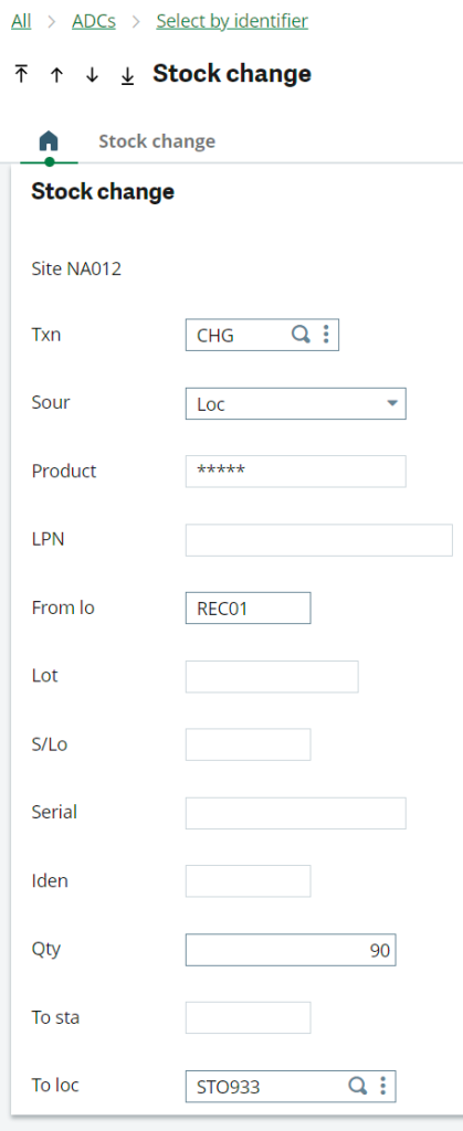 Once the user selects the “Stock change transaction” function the screen below will appear. Please note that this is a “one for all” transaction function where every product in the current location will be moved to the new location. In our example everything from “REC01” is being moved to the new location “STO933.”