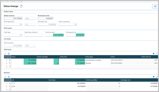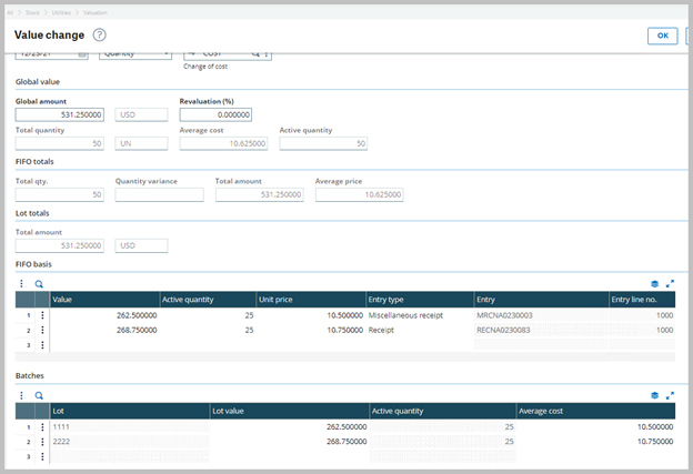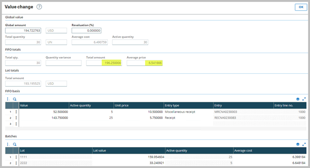 Value change screen: Global values match the product site record and the FIFO totals with FIFO stack lines.