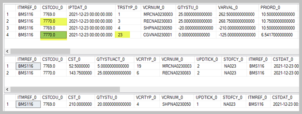 For an item that is valued at FIFO (First in First out), we can use the value change function to modify the FIFO basis lines. This will generate a stock movement record in STOJOU with a TRSTYP of 23. Lately there have been some changes in this area and the recommendation is to modify each FIFO layer at a time.