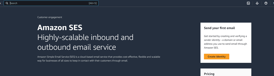 First up, you will need to login to your AWS Console and search for SES. Click on the Simple Email Service link to be greeted by the following screen. You will need to establish an identity with SES so that you confirm the ownership of your business domain or email address and accept certain fair and rightful usage policies. Click on “Create identity” to get started.