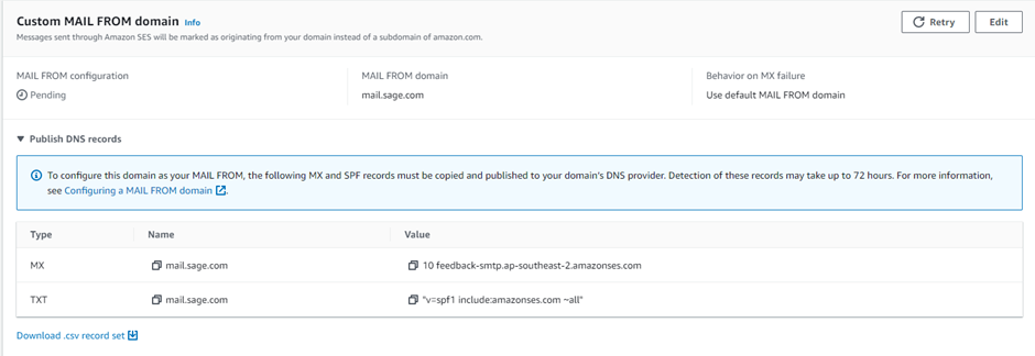 Click the Create Identity button and you will be given a set of CNAME, MX and TX records you will need to add to your DNS settings so SES can confirm the ownership of your domain as well as establishing a certified SPF and DKIM relationship with your DNS server.