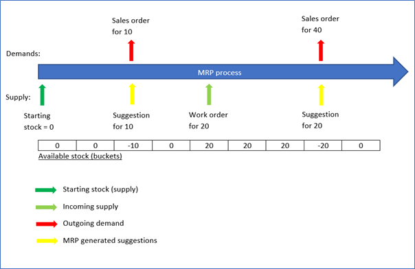 The MRP process covers a period of time. This time period is divided into ‘buckets’ (these can be days, weeks, and/or months). If the available stock falls below zero by the end of each bucket (i.e., the demands outstrip the supply), then a suggestion is generated in order to make up the shortfall.