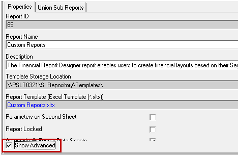 With your report selected in Report Manager, select “Show Advanced” on the Properties tab: