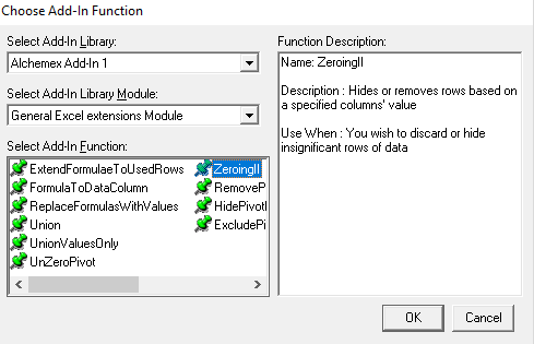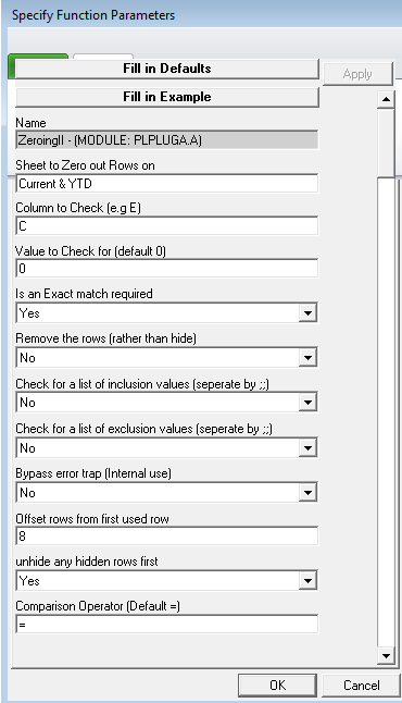 The “Specify Function Parameters” window displays. Buttons at the top let you see the default values or an example filled in. In the following screenshot, we’ve filled it in based on our report at the beginning of this article: