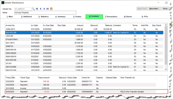 Here is what the Wire Transfer payment transaction looks like in Vendor Maintenance and Inquiry:
